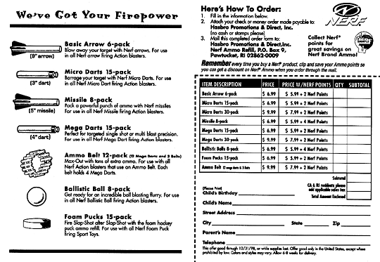 This is the most current Nerf® ammo Refill form. WARNING if you print this page (or save the image and print it later) the picture will most likely not come out. Screens use approximately 500 dpi, while the average printer uses about 1000 (trust me printers actually can print about 2x what they say their maximums are) thus, the picture will be unreadably blurry. There are several downloadable versions in the download section of my site. Feel free to download a much higher resolution version and print it later.